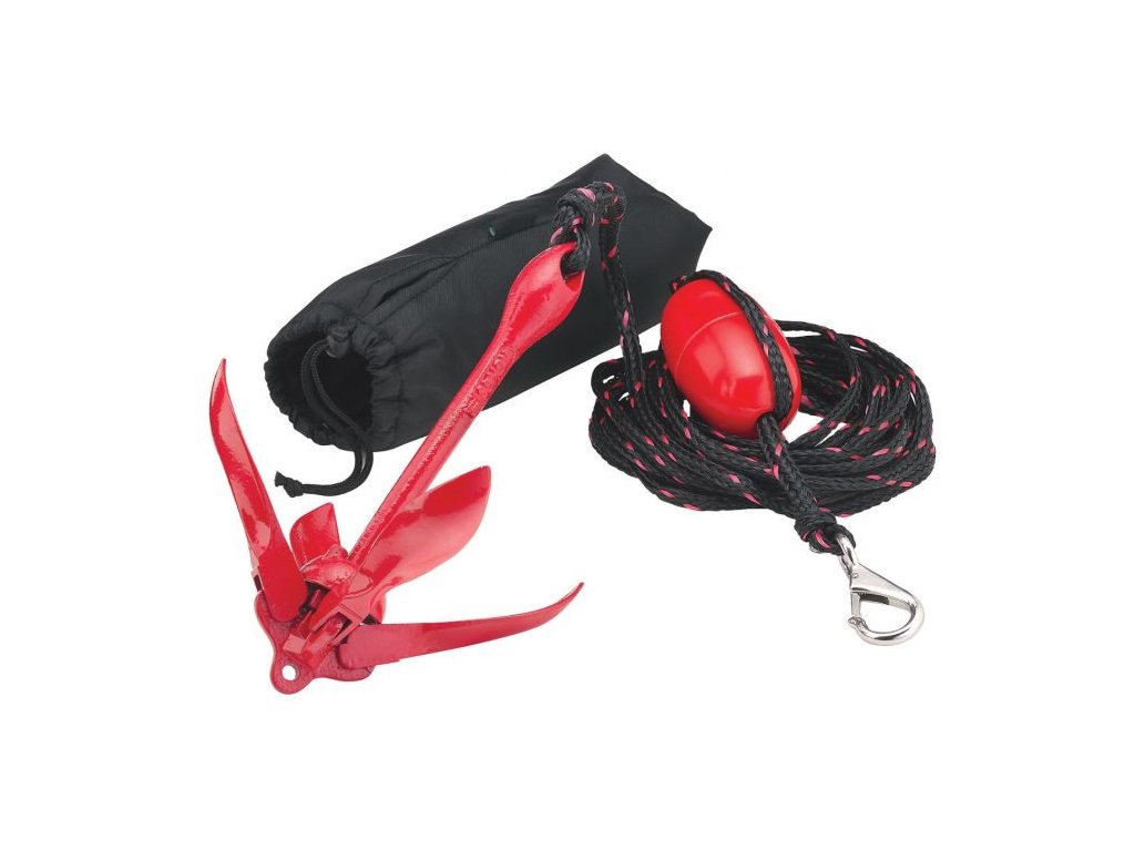 Skladacia 1,6kg kotvas ochranným náterom. Ideálne pre dočasné kotvenie skútra a malých člnov v blate, piesku, štrku a skale. Obsahuje 25' (7,6 m) lodné lano s in-line bójou, odolnou karabínkou z nehrdzavejúcej ocele a nylonovým úložným puzdrom.