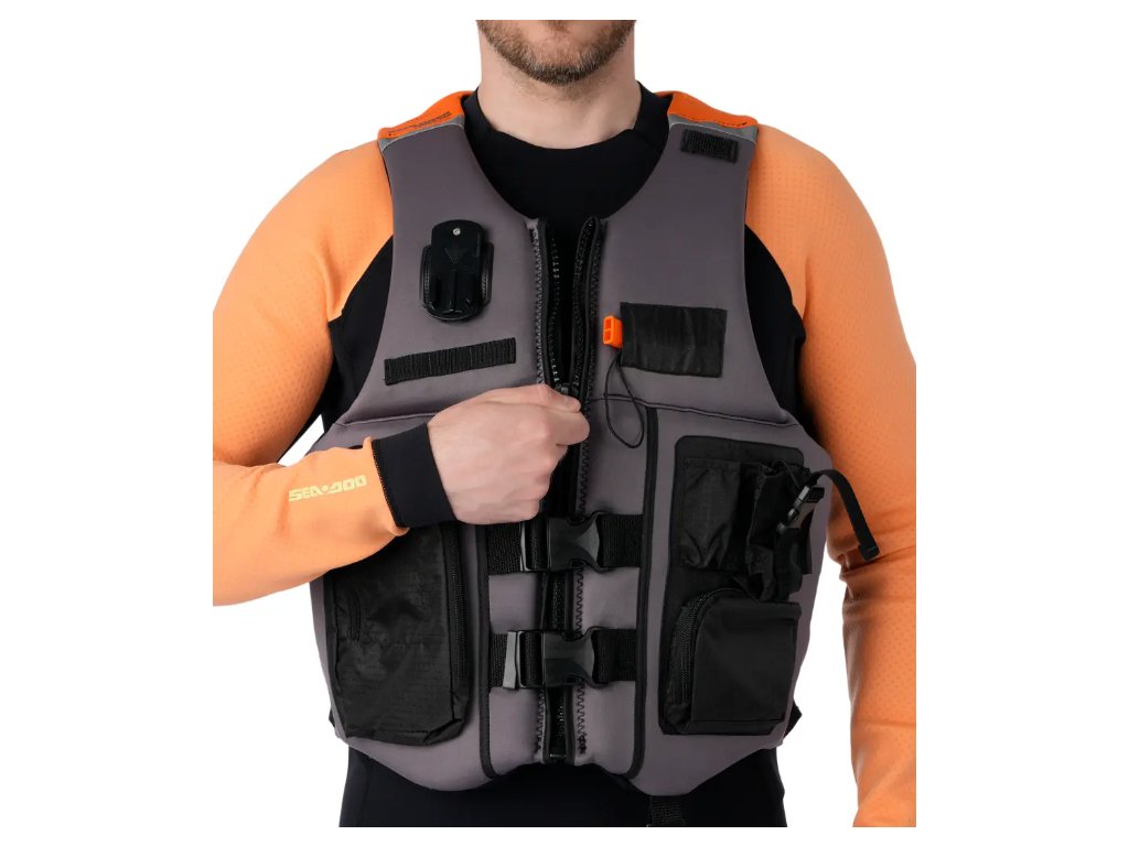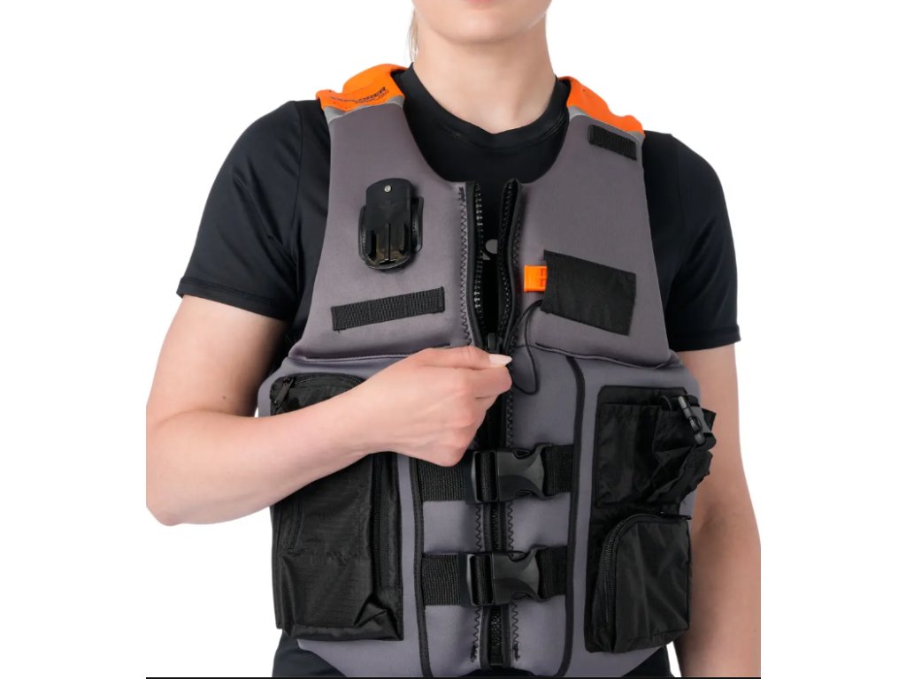 YKK predný zips uľahčuje obliekanie a viacero praktických doplnkov – držiak kamery, držiak na vysielačku VHF, pútko na okuliare, D-krúžok na šnúrku od kľúčov, píšťalka a niekoľko úložných vreciek – z nej robia ideálneho spoločníka na každé vodné dobrodružstvo.