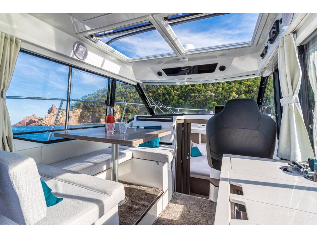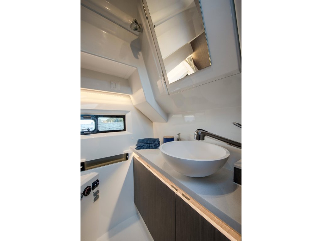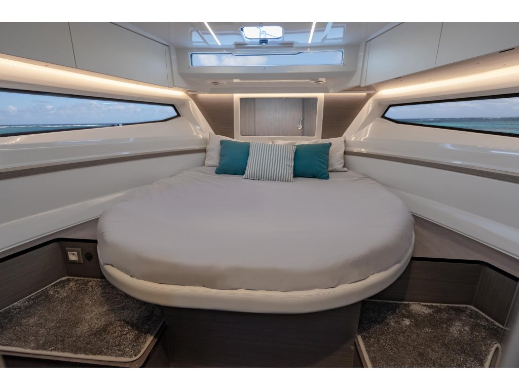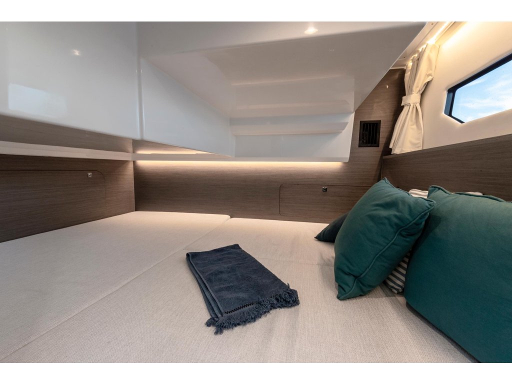 - výbava PREMIERE (elektrický kotevný naviják, matrace a opierky v zadnej časti plavidla, 60L chladnička, sprcha v kokpite, elektrické trim klapky LENCO, ambientné LED osvetlenie v salóne, kajutách a kokpite, sedenie nad toaletou, čalúnené čelo postele v prednej kajute, záchytné SST oko pre prívesný vozík)