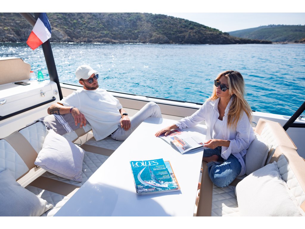 Otvorená paluba ponúka veľkorysý priestor pre pohyb posádky a flexibilné využitie počas celej plavby. Predná časť člna je vybavená komfortnou opaľovacou plochou, ktorú je možné prispôsobiť aktuálnym potrebám – či už na relax, sedenie alebo prepravu výstroja. Zadná časť poskytuje pohodlné sedenie a jednoduchý prístup k vode, čo oceníte pri kúpaní aj športových aktivitách.