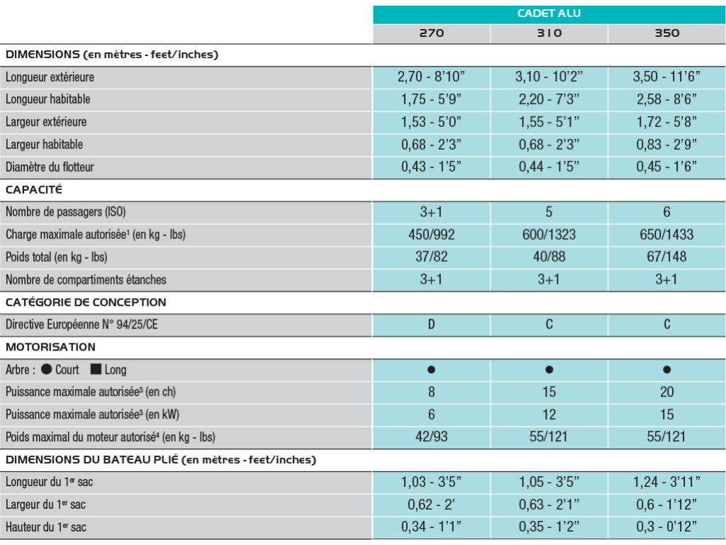 Jeho prednosťou je použitie kvalitnejších materiálov a zváranie zostavy valcov, ktoré zaisťujú optimálnu odolnosť a životnosť. V bohatej a kvalitnej výbave nájdete niektoré z patentovaných jednotiek Zodiac Nautic, ako je rowlock s trojrozmerným nastavením alebo skládka s vnútorným ovládaním, pohodlnejšie a bezpečnejšie. Dostupné v 3 variantoch veľkosti, ktoré si môžete vybrať v závislosti od dostupnej úložnej kapacity a nosnosti. Dostupné v 3 veľkostiach CADET ALU 270/310/350